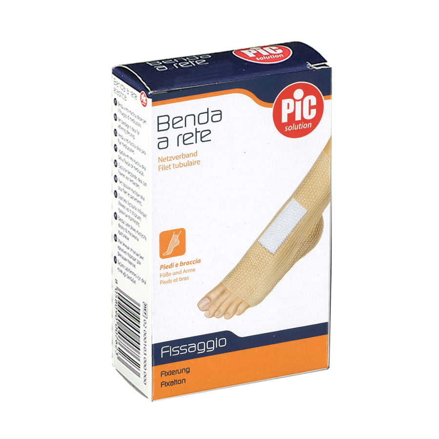 - Benda tubolare elastica, costituita da una rete a trama larga ad estensibilità pluridirezionale, per il fissaggio di medicazioni su qualsiasi parte del corpo.